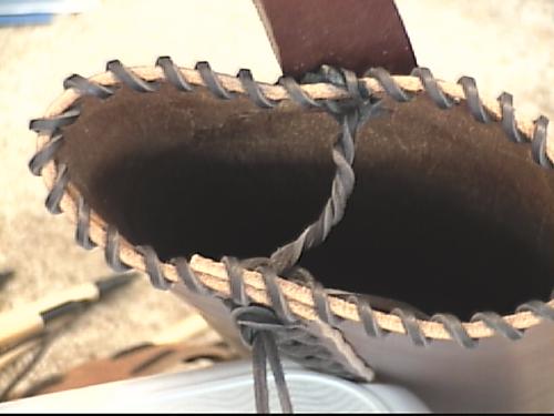 You can tie off all lace ends with single or doubled overhand knots. When lacing the bottom and top edges, I like to tie off with a single overhand knot, then saturate the knot with CYA and cut off the ends close when cured.
