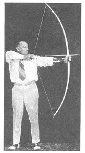 POINT OF AIM SHOOTING. This is the only method to use if you expect to become a proficient target shot. All the top notchers either use "Point of Aim" or a sight of some sort. Study the Plate "Aiming by Point of Aim." What you do is to find a spot on the ground (for short ranges-say 60 yards and under) or a spot in a tree (for long ranges-say 80 to 100 yards) on which you rest the pile or tip of your arrow. If you always rest the tip of your arrow on this spot, your arrows, if they are all the same in length and flying qualities, will fly and land in the same place. Suppose you want to find your "Point of Aim" at 40 yards. With a 6'0" bow 45 pounds drawing weight, it may be halfway between you and the target. Go back to where you first stood. Draw the arrow under your chin, sight down diagonally across the head. Follow this imaginary line to the ground. It may rest on a tuft of grass or bunch of clover. Place a point of aim, marker, a wad of paper or a stone at this spot. Draw your arrow under your chin, rest the tip of your arrow on the "point of aim" which you just marked with some object, and release your shot. If your arrow flies over the target, move the marker in closer. If it falls under the target, advance your marker. You also can control left and right direction by moving the marker either way. An important point to remember: Keep your eye on the "Point of Aim". You see the target only vaguely or not at all. Experiment until you get the idea. The Plate shows the method quite clearly. Once you have mastered "Point of Aim Shooting", your target scores will go up by leaps and bounds, you will begin to find fault with your arrows, and demand better and better matching until you have driven honest fletchers crazy.