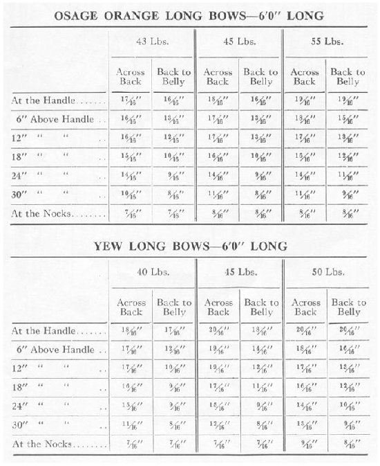 Bear in mind that the figures were taken from finished bows, but that is no guarantee that if you follow them your bow will weigh the same. If you wish a 45 pound bow follow the measurements for the next higher weight given, and then you may scrape your bow down a bit if it results in too strong a bow. You can always take off wood, but you can't put it back on.