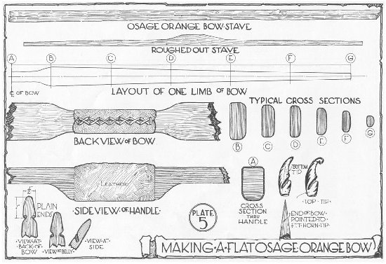 Osage Orange lends itself beautifully to the Flat, Semi-Indian Type of bow. Read again the section on making the Flat Bow of Lemonwood. With an osage stave 5'6" long in your possession, the first step is to transform it into a Flat Bowstave.